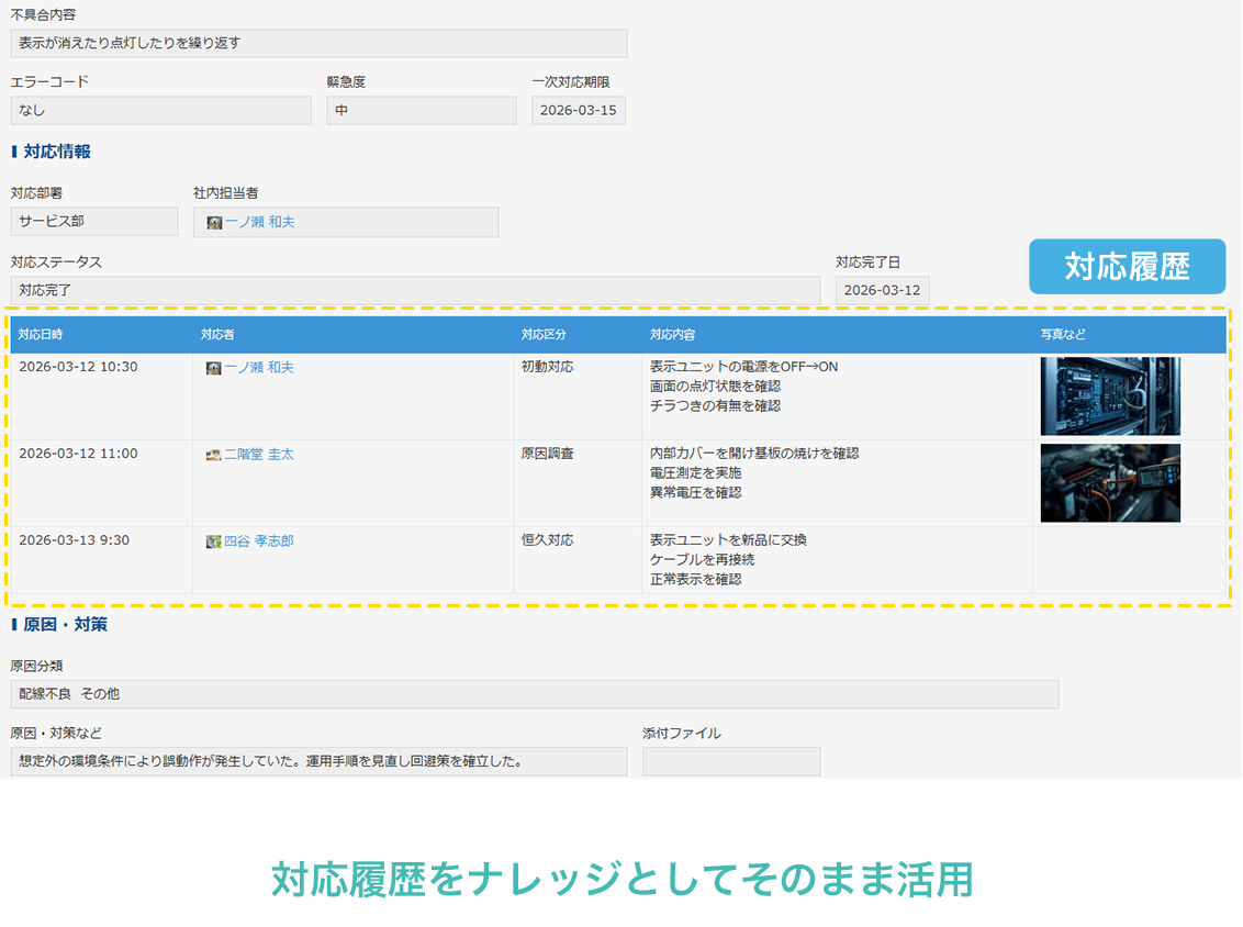 設備機器の不具合対応を一元管理できるアプリです。受付から対応履歴、原因・対策までを記録し、対応状況の見える化と対応漏れ防止を実現します。また、過去の同様事例を検索・参照することで、経験の浅いメンバーでも初動対応の判断ができ、現場での対応力向上につなげることができます。