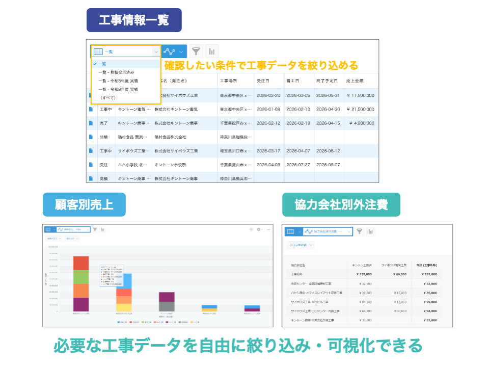 顧客名・現場名・担当者・工事種別など様々な条件でデータを絞り込んで可視化できます。さらに、現場別・顧客別などの集計も柔軟にできるので、会議資料の作成や売上管理に活用できます。
