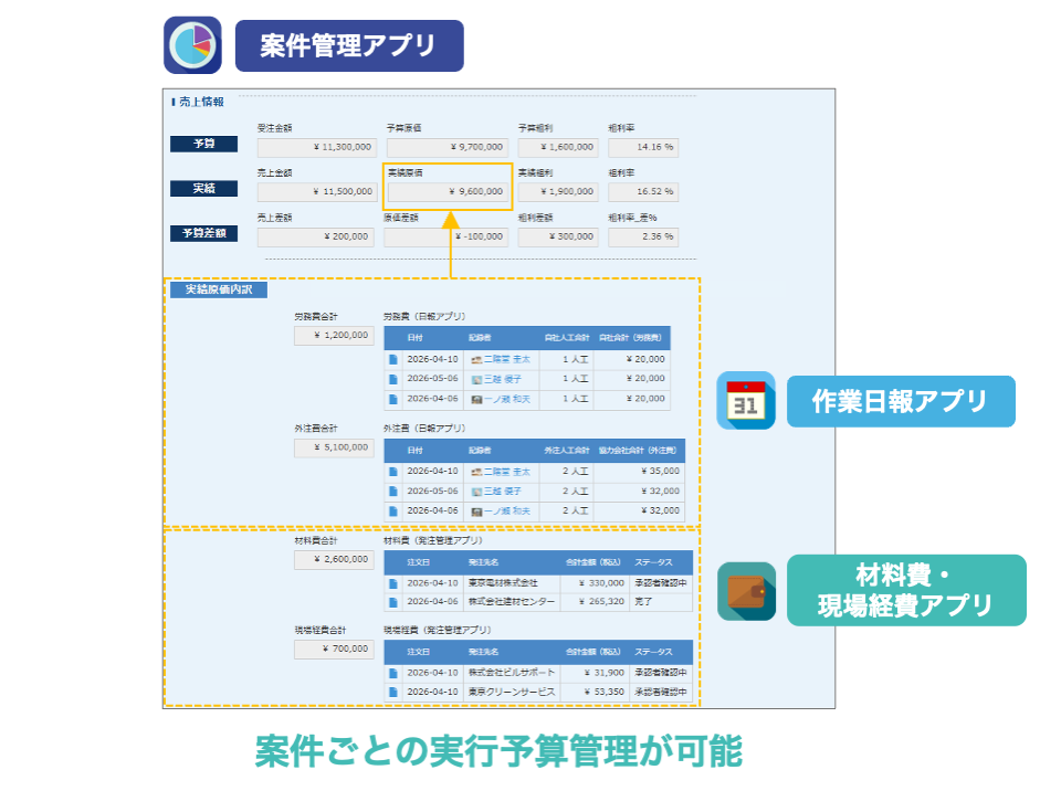 案件管理アプリでは、案件ごとの実行予算をシンプルに管理できます。日報や発注管理アプリと連携しているので、工事単位で見込みや原価、損益を把握しやすくなっています。