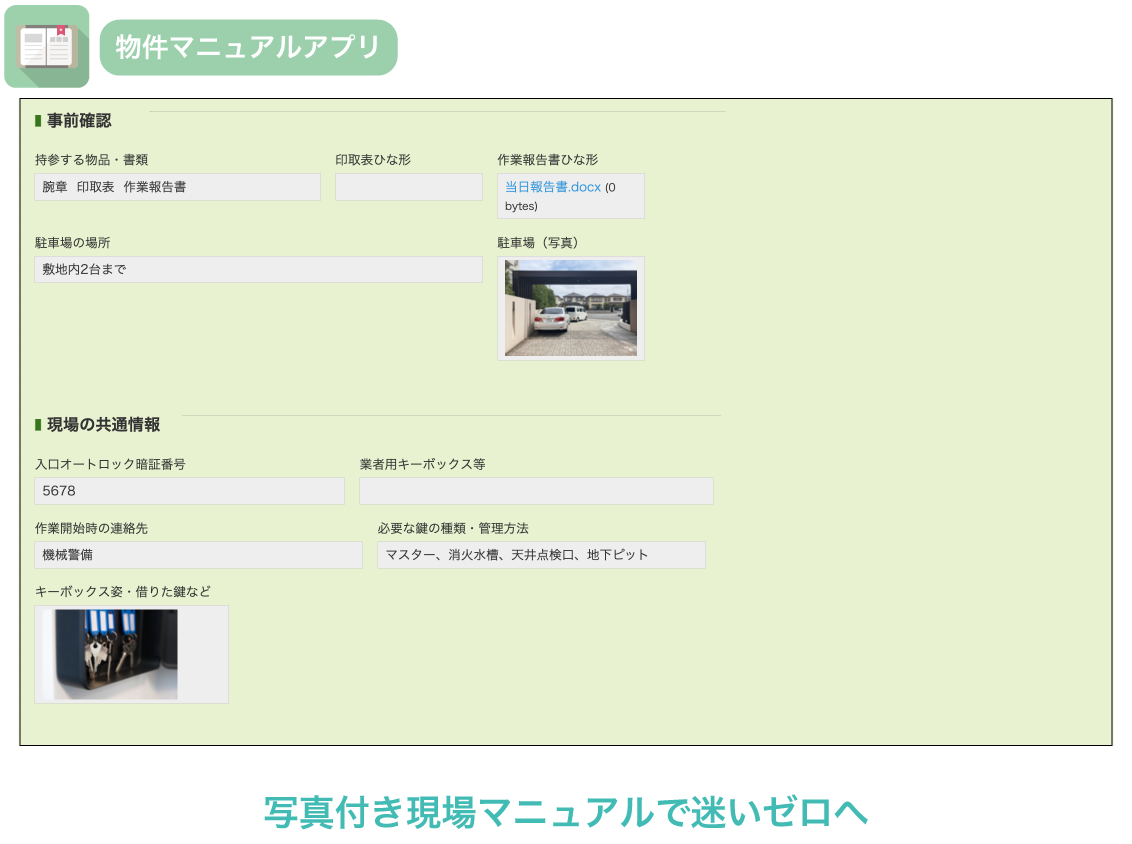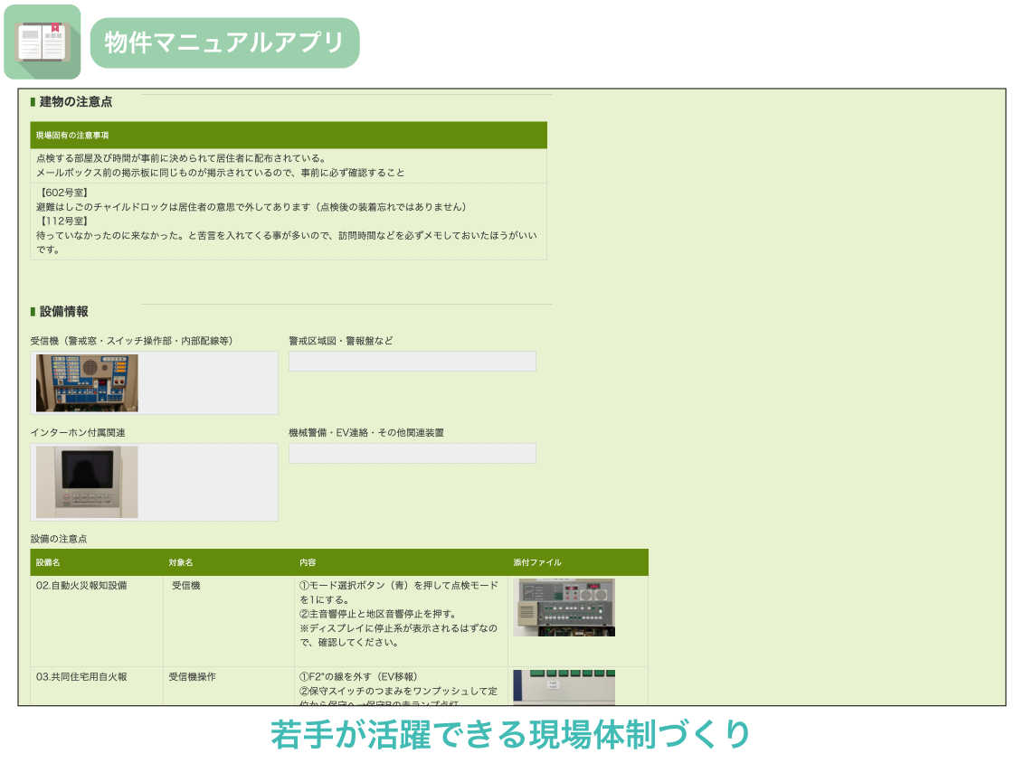 消防設備業の現場点検に必要な「取引先管理」「物件管理」「各物件の点検マニュアル」をワンパッケージ化。属人的になりがちな情…