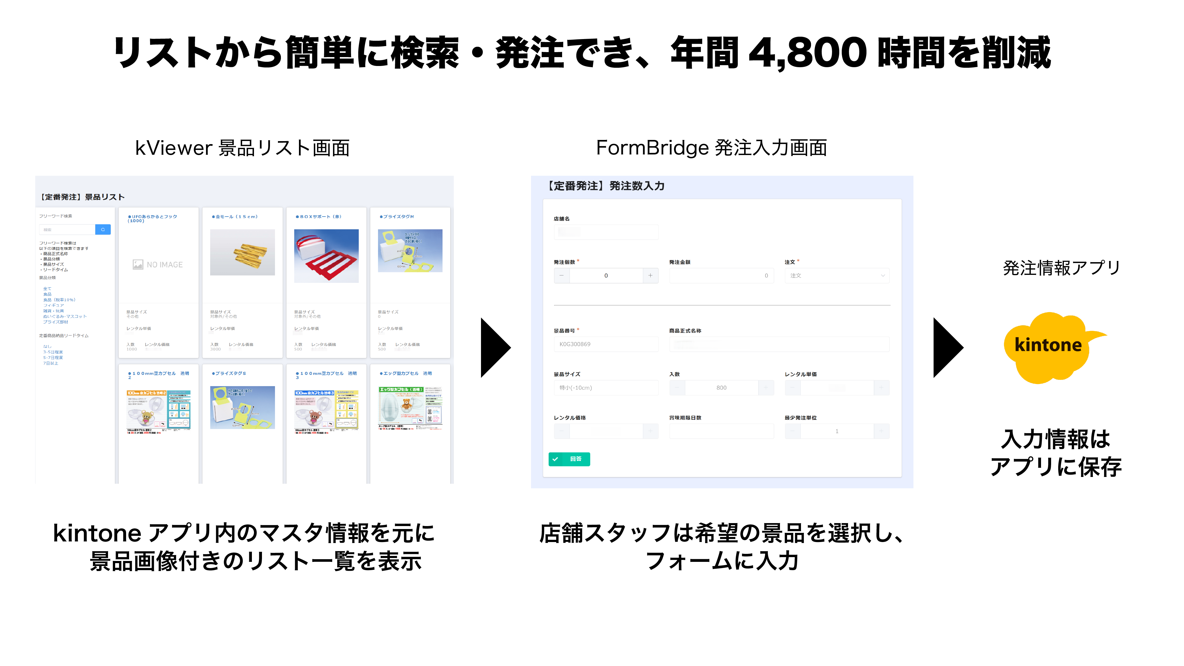 また、店舗に設置されたクレーンゲームの景品発注の仕組みもkintoneでアプリ化されている。「以前はぬいぐるみをはじめとした景品の発注にExcelを用いていましたが、発注可能な景品の種類が膨大にあるため、店舗側ではお目当ての景品を探して発注するのが大変でした。今は商品画像付きのマスター情報を参照しながらFormBridge経由で発注できます。人気のある商品ランキングを見ながら売上拡大につながる人気商品の発注が容易になったことで、店舗からも好評です」と寺井氏は評価する。