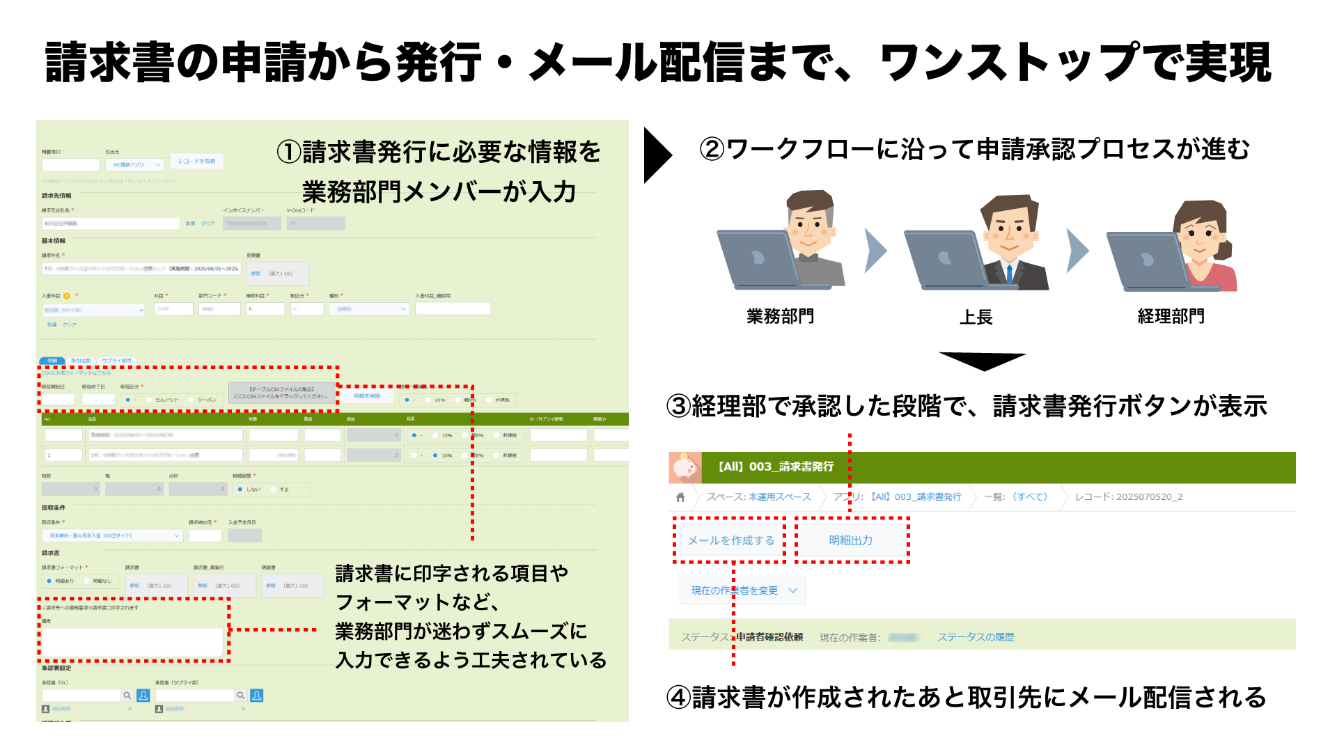 開発ユニットが作成したアプリの具体例は、基幹システムでは対応できない一部特殊な請求書発行業務に関する請求書発行アプリだ。請求書発行に必要な情報を業務部門メンバーが起票すると、事前に設定されたワークフローに沿って申請承認プロセスが進み、最終的に経理部門側で承認した段階で請求書発行ボタンが表示される。gusuku Customineによって事前に設定されたフォーマットにて請求書が作成され、その後kMailerを使って取引先にメール配信される流れだ。「値引きやキャンペーンといった、汎用的な基幹システムでは対応できない特殊な相殺処理が必要な請求処理に対応するため、相殺処理に関する情報を扱うアプリを作成しています。この処理を親アプリとして登録し、部内に共有したい情報と請求処理に必要な情報をそれぞれ子アプリとして連携させています。1度の情報入力で2つの業務にうまく連携できる状態を作りました」と池谷氏は説明する。
