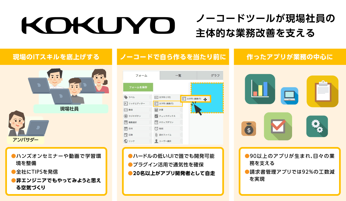 文具や家具のみならず、ワークスタイルおよびライフスタイル領域に必要なソリューションを幅広く提供するコクヨ株式会社。同社のビジネスサプライ事業本部では、テクノロジー活用によるビジネス変革を推進しており、非エンジニアでも日々の業務改善につながるアプリを開発できる基盤として、サイボウズのkintoneを採用しました。その経緯について、ビジネスサプライ事業本部 Bサプライシステム本部 本部長 内田 一雄氏、同本部 開発ユニット システム2G 岩坂 真奈氏および同G 池谷 和実氏にお話を伺った。