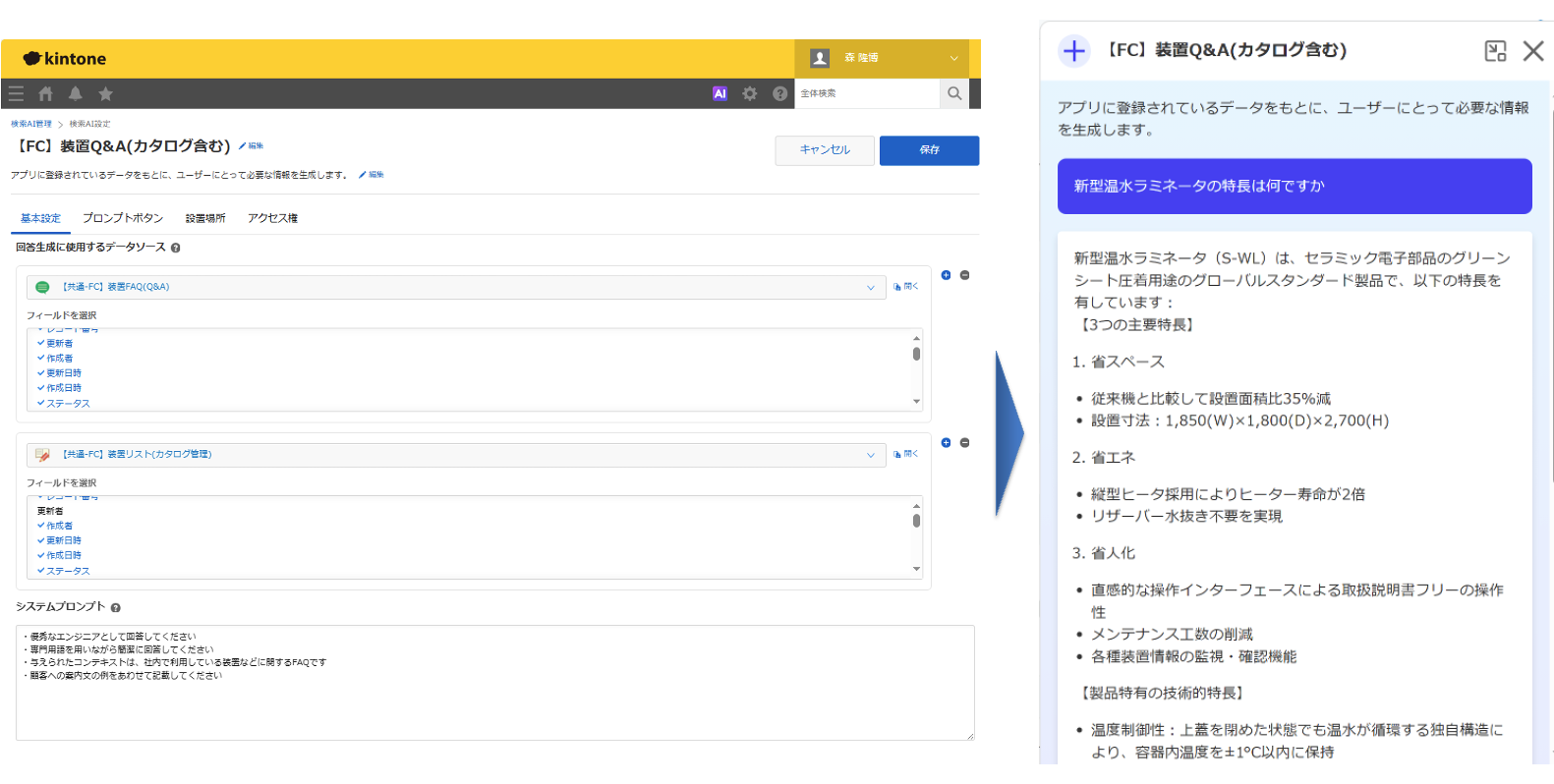 kintoneにAI機能が実装されてからは、kintoneに蓄積されたデータを用いた実験的な活用が始まっている。新卒や中途の営業担当向けには、装置Q&Aアプリやカタログアプリを参照するプロンプトを用意し、AIに装置のPR文を書かせている。主力装置である温水ラミネーターについても、特徴や強みを押さえた紹介文を自動生成できるようになった。