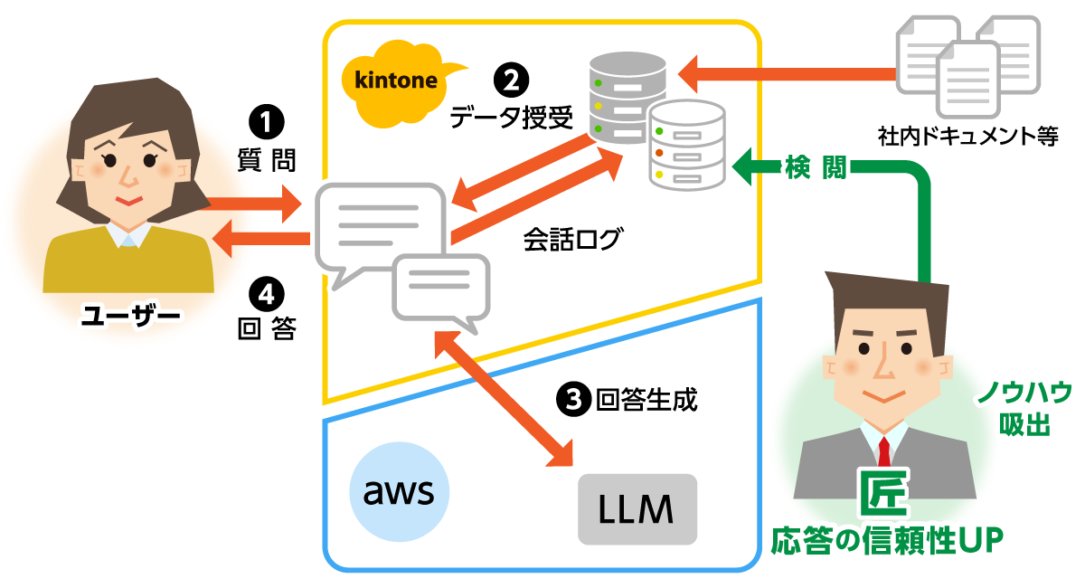 現在、同社ではAIと匠とのやり取りを通じてノウハウを蓄積する仕組みが動いている。匠がAIの回答内容を確認し承認すると、その情報が自動的にkintone上へ整理・登録される。こうしてベテラン社員の経験知をAIが学び取り、次回以降の回答に反映していく。現場で蓄積された“生きた知見”が、AIによって可視化・再利用されるプロセスが形成されたのだ。