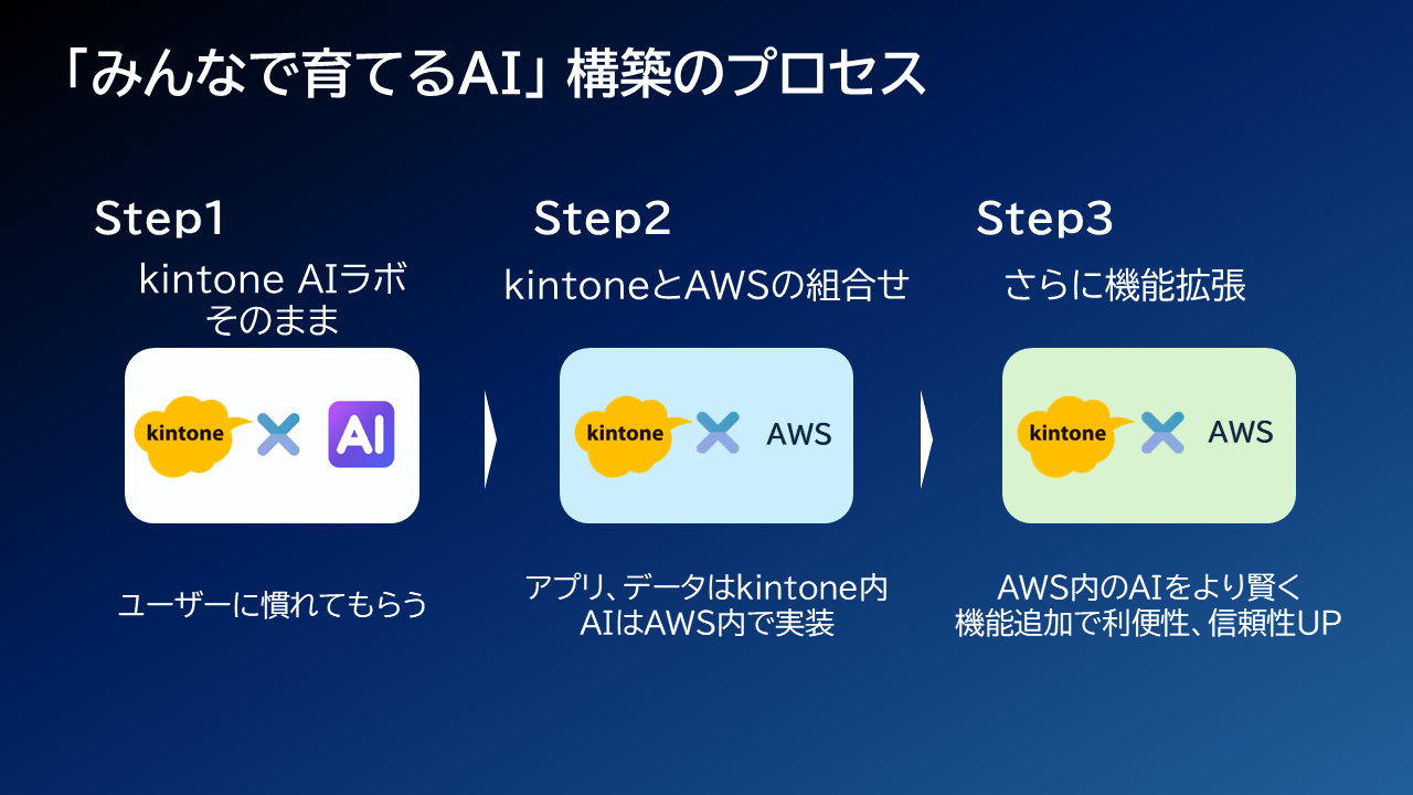 続くStep2では、kintoneでAIの学習データを整備し、AWS上にAIを置く形に組み換えることでAIの機能拡張の基盤を構築。さらにStep3で、AIの回答精度を高めるための検証・学習プロセスを追加し、利便性と信頼性の両面を強化した。「ベテラン社員、つまり“匠”がAIの回答をチェックし、正しい内容を反映させるようにしました。匠のノウハウを吸い上げ、AIの応答の信頼性を高めていく取り組みを続けてきました」と根上氏は説明する。