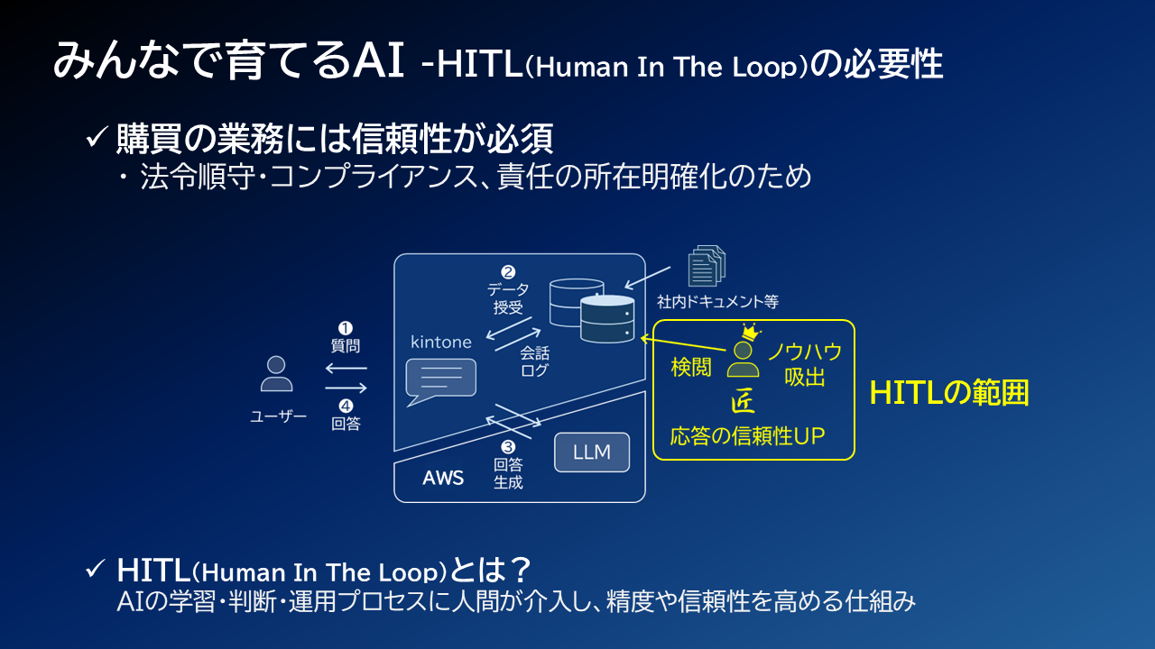 一方で、AIの活用を進める上で欠かせない要素として挙げられたのが「HITL(Human In The Loop)」の考え方だ。根上氏は「購買業務では、法令遵守やコンプライアンスなど、信頼性の確保が不可欠です。AIに任せきりにするのではなく、人の目で検証し、誤りがあれば修正していく。そのプロセスを通じて信頼性を高めています」と説明する。HITLとは、AIの学習や判断のプロセスに人が介入し、精度を補正する仕組みのこと。AIの便利さを最大限に活かしつつも、人の経験と判断が必ず介在する体制を築いている。