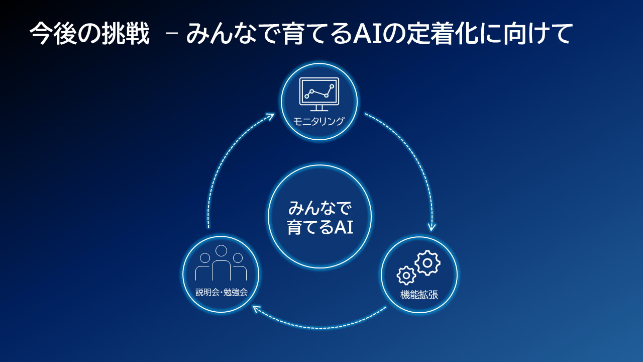こうした地道な改善を積み重ねながら、チームは今後の定着化に向けたサイクルを描いている。「モニタリングしながら機能拡張を行い、説明会や勉強会で理解を深めるという流れを継続したいですね。まだ始まったばかりの取り組みですが、使えるAIに育てていきたい。精度を8から9割まで高めるのが目標です」と根上氏は意欲を見せる。