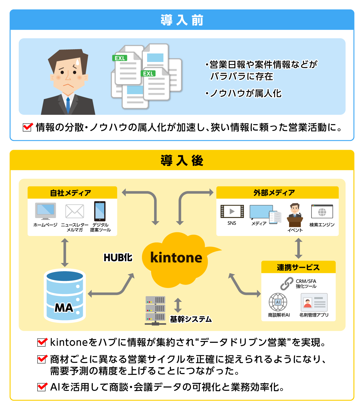 すでに2017年からkintoneを活用していたが、案件管理が中心で営業活動やスキルの可視化は十分ではなかった。