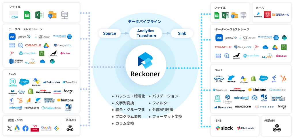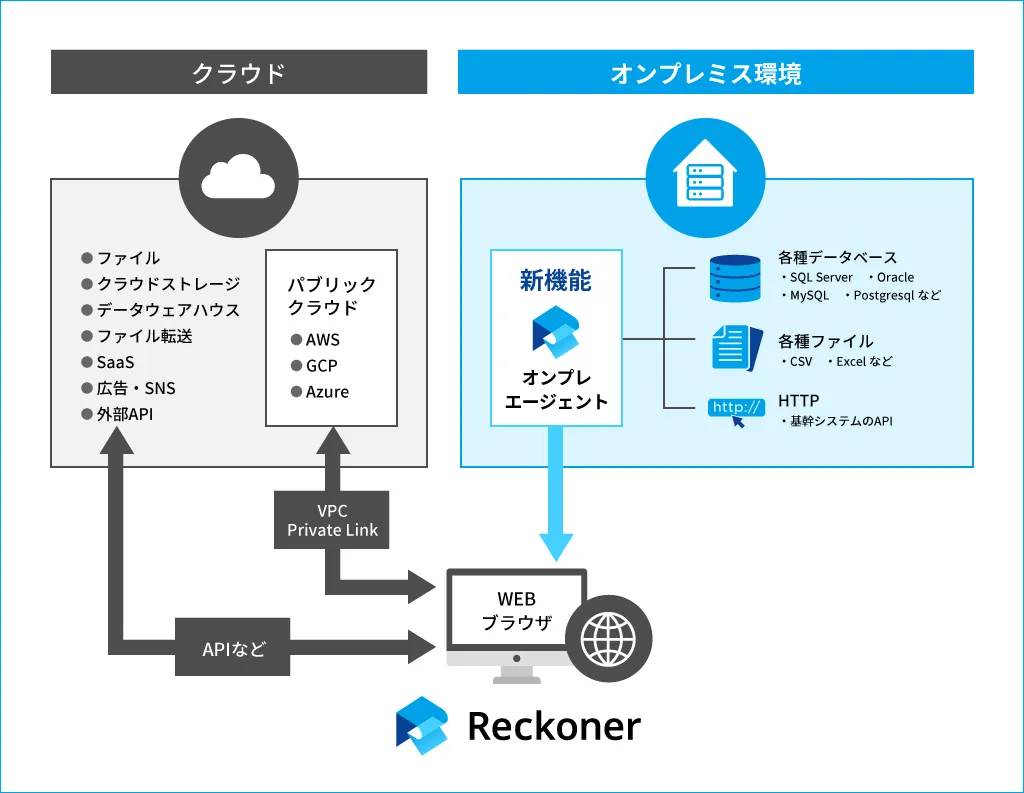 Reckonerなら、クラウド環境のデータだけではなく、オンプレミス環境の基幹データやファイルなども連携が可能。