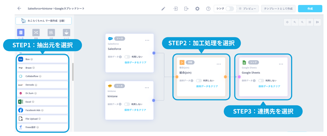 プログラムは一切不要!圧倒的使い易さを追求したノーコード型データ連携ツールの決定版。kintoneとSalesforce、SmartHRなどSaaSやファイルを簡単連携。