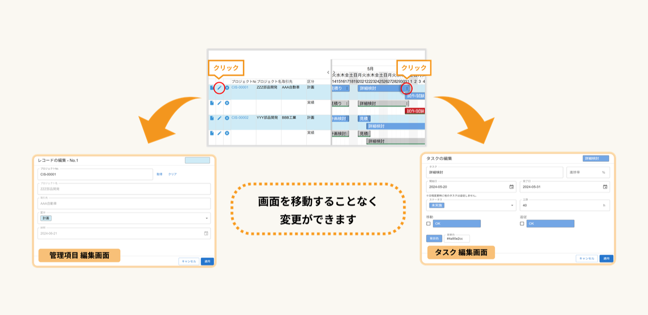 kinveniシリーズ:ガントチャートを利用すれば、確認したいレベルに応じて切り替えて表示できます。同一アプリ内で一元的に管理できるため、関連する情報の確認がスムーズに行えます。