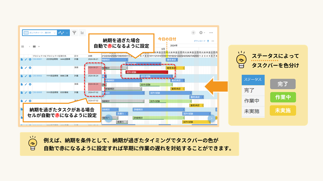 タスクの内容、ステータス、期限などの条件によってタスクバーの色を変更できます。タスクの状況を視覚的に把握しやすくなります。