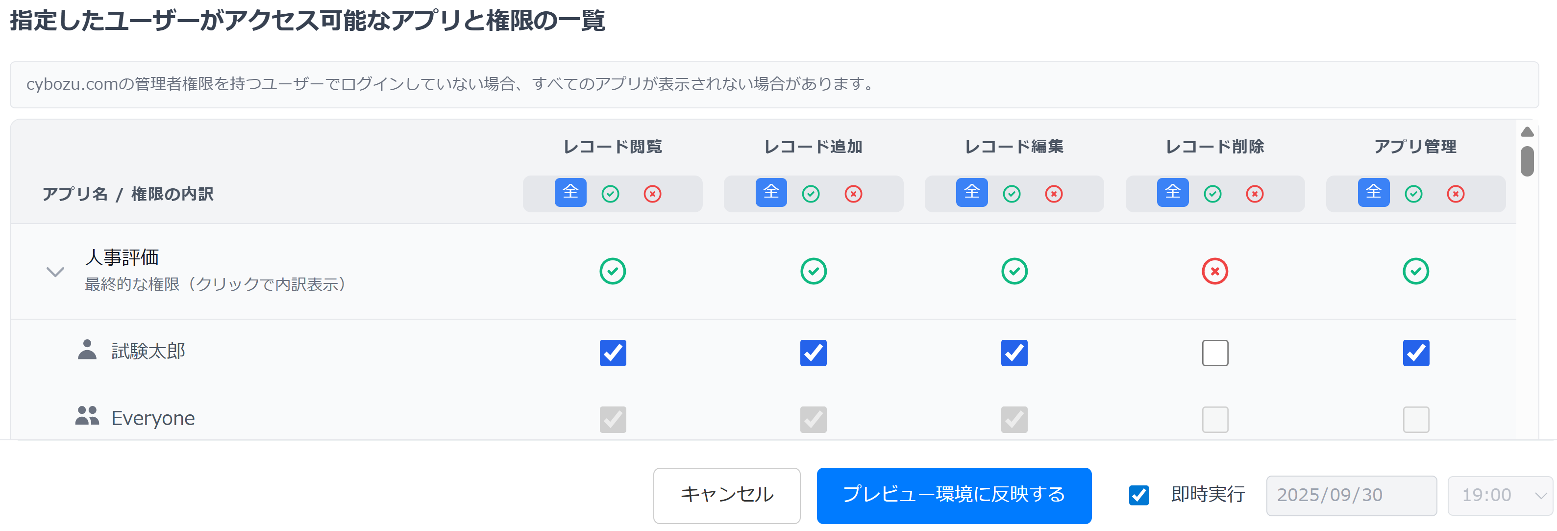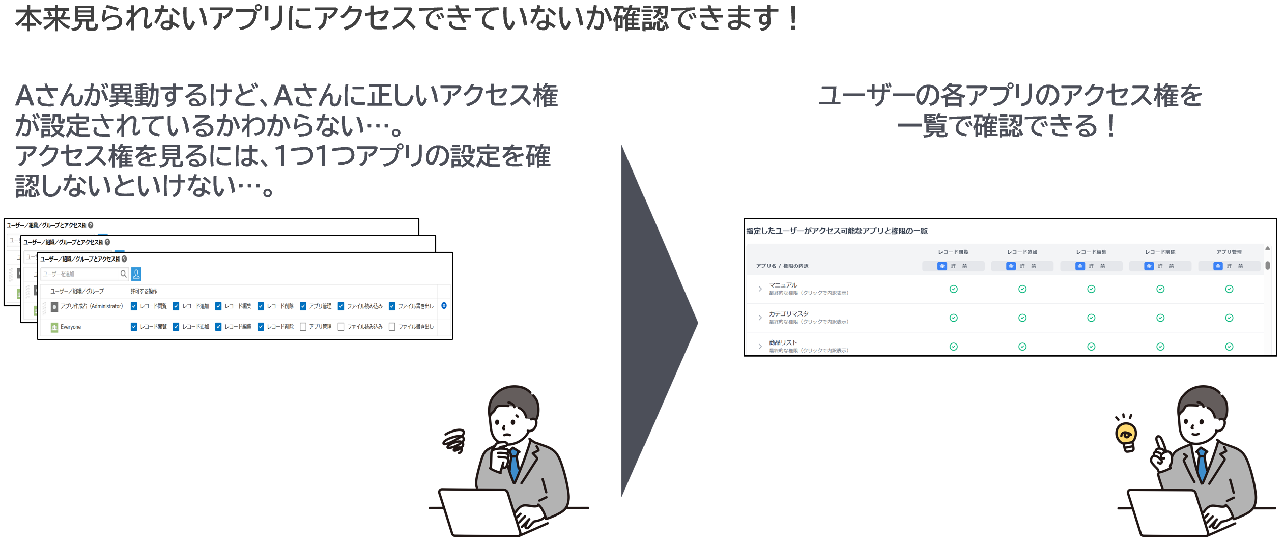 ユーザーごとに、どのアプリにどのようなアクセス権が設定されているかを一目で確認できます。