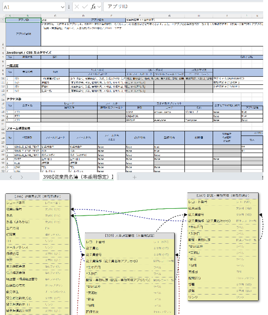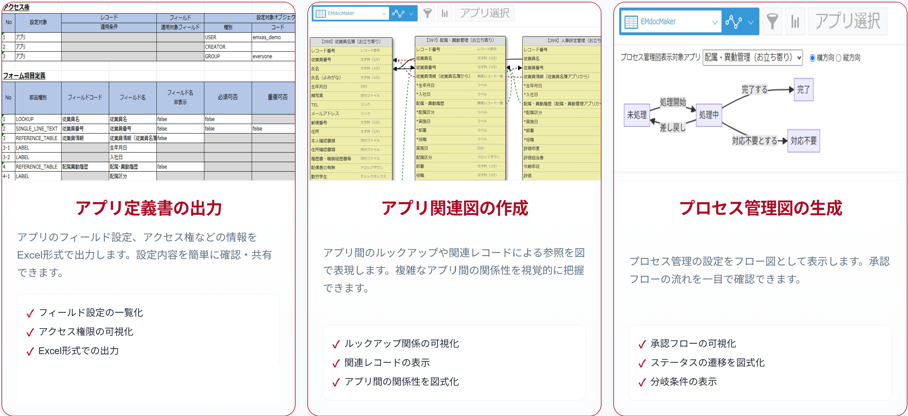 アプリ定義書(アプリの設定情報をExcelに書き出したもの)をEMdocMakerから読み込むことで、kintoneアプリの設定を変更可能です。