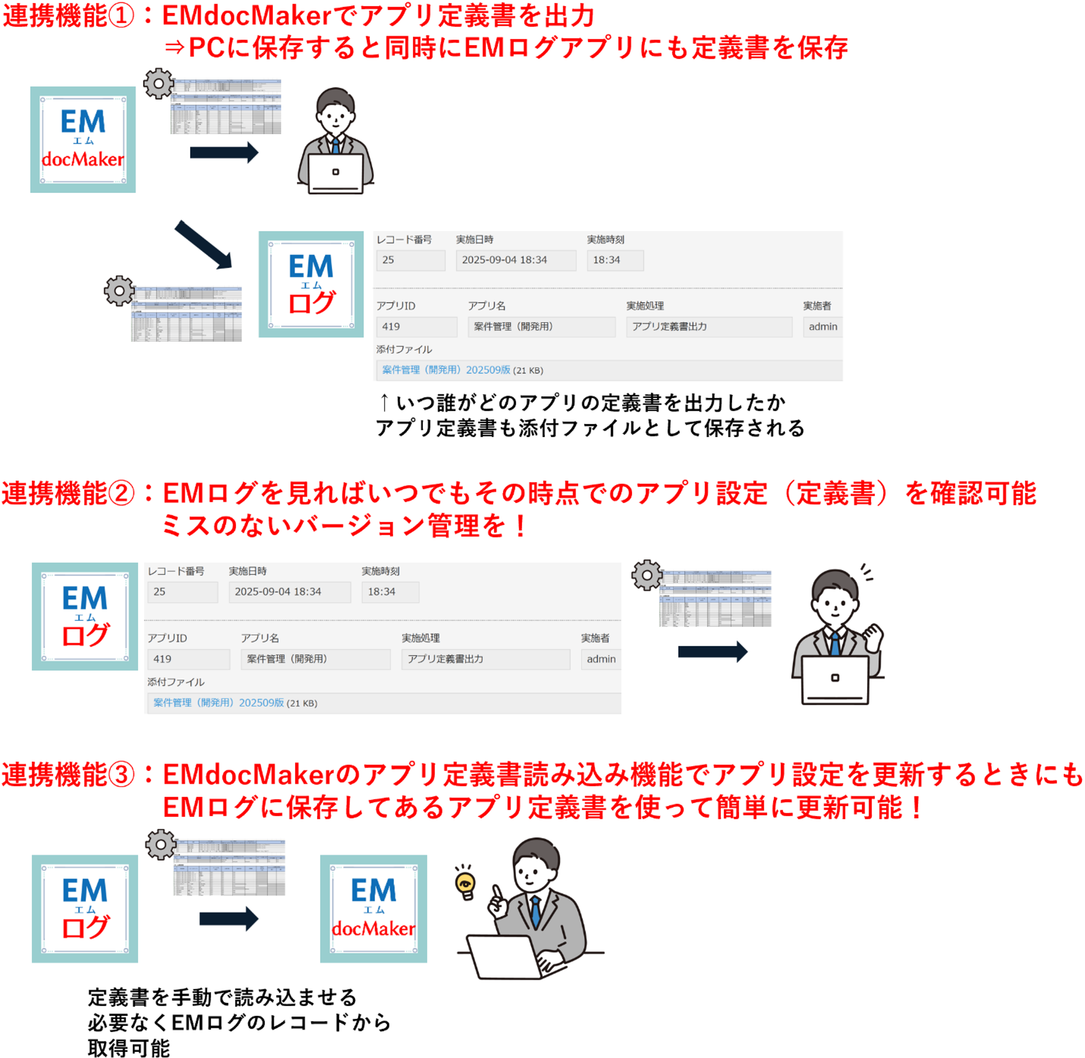 EMログを併用することで、EMdocMakerで出力したアプリ定義書を自動的にEMログアプリへ保存可能です。