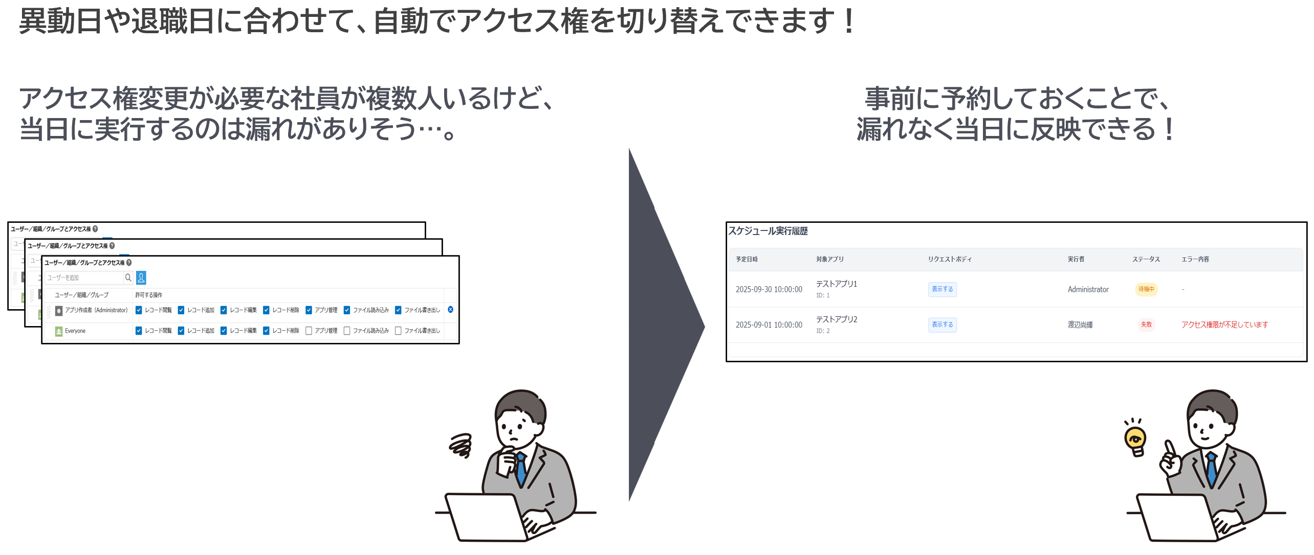 また、アクセス権の変更は即時反映に加え、指定した時間に予約実行することも可能です。