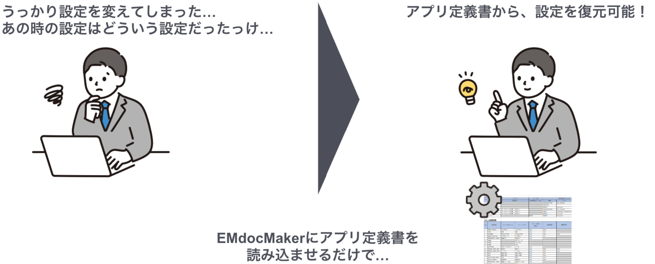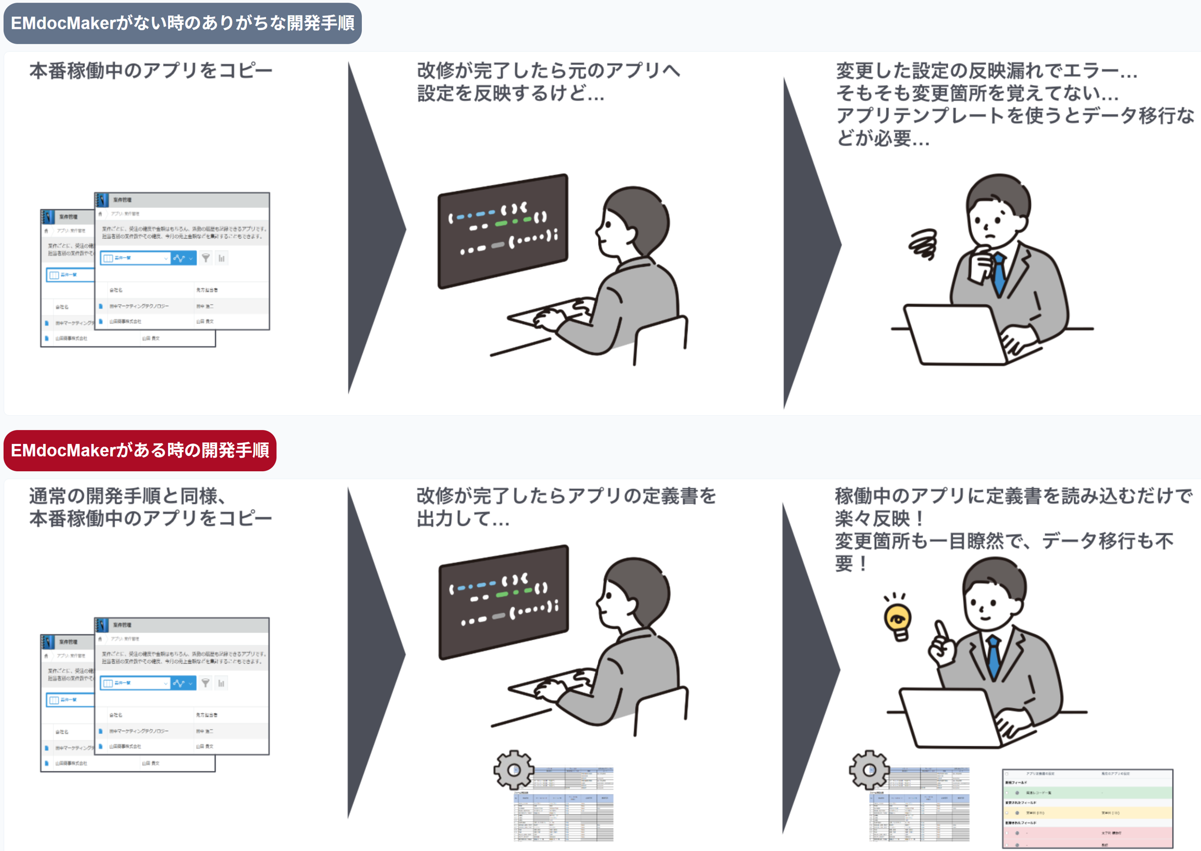 EMdocMakerを使用すれば、アプリ定義書を使って効率的に変更を反映でき、ミスなく簡単にアップデートを適用できます。