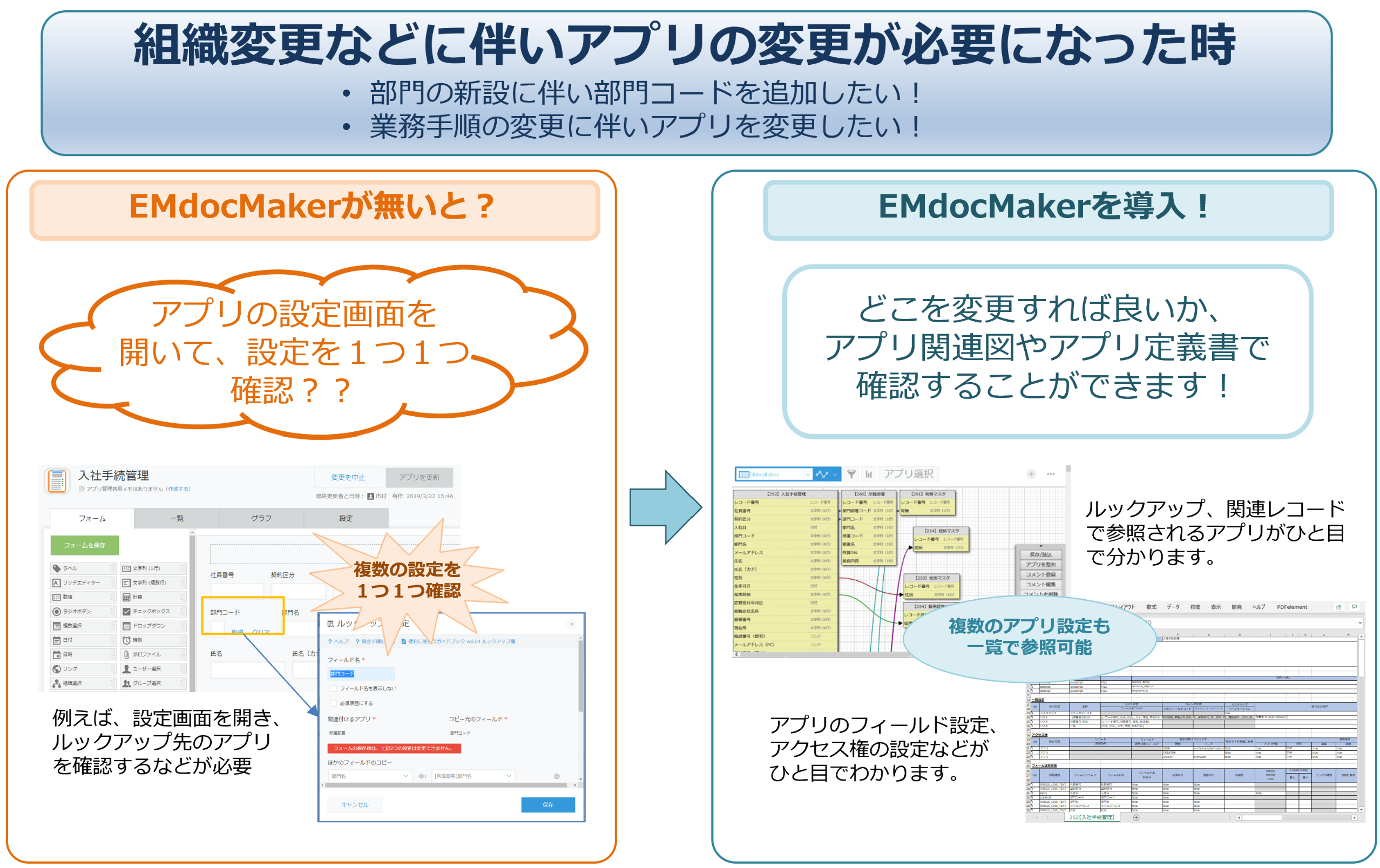 人事異動時など、アプリの現状や改修ポイントを共有する際にEMdocMakerを活用できます。