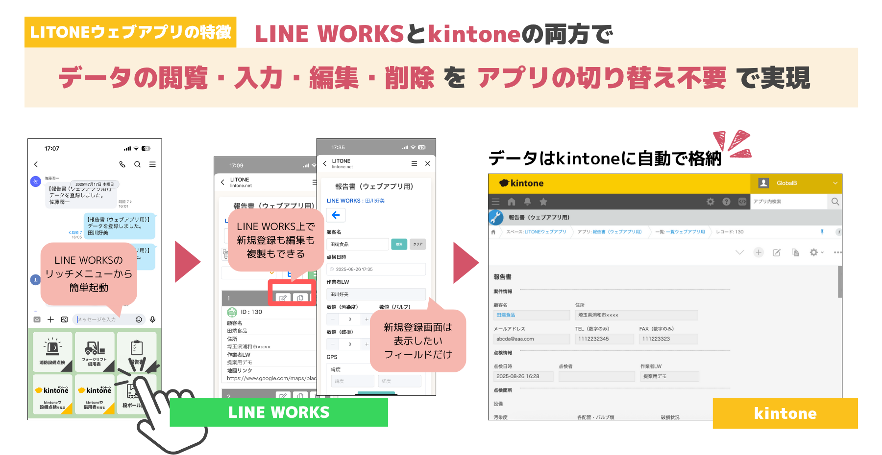 LITONEウェブアプリは、LINE WORKSとkintoneをアプリの切り替えなしで使える業務アプリです。