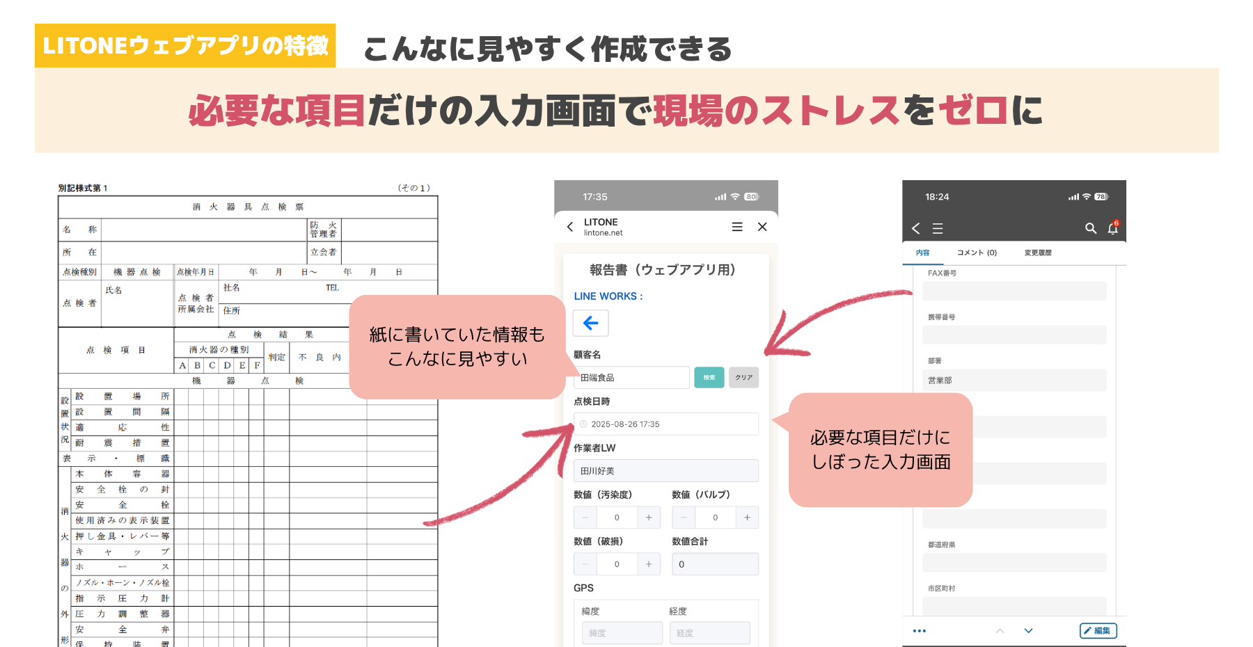 LITONEウェブアプリでは、紙の点検表やkintoneの標準画面のように項目が多すぎて入力が煩雑になることを防げます。