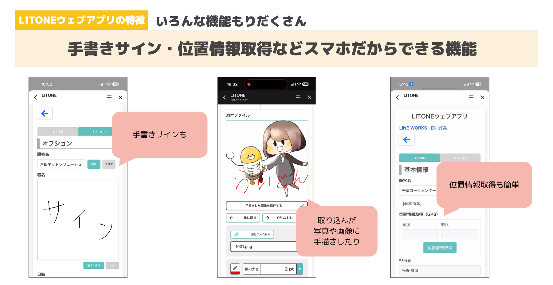 スマホだからできる!手書きサインや位置情報取得もワンタップ