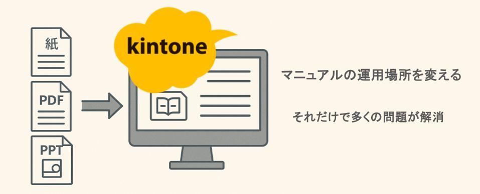 紙、PDF、Excel、PowerPointなど、バラバラなファイル形式で管理されていたマニュアルをkintone上で一元管理。