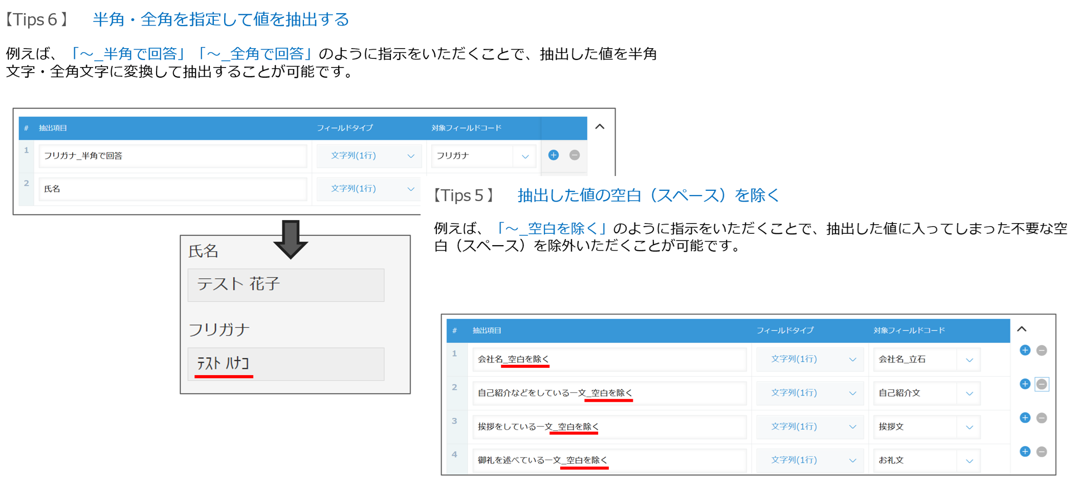 例えば、AI-OCRで抽出したフリガナを半角・全角カタカナに変換したり、氏名間のスペースを削除・追加したりするなど、値を加工したうえで登録することが可能です。