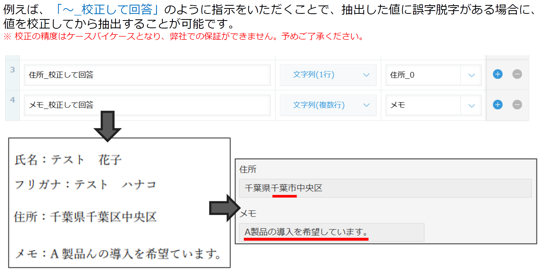 カスタム読取り項目により抽出したデータに誤字脱字等がないかAIがチェックを行い、結果を自動的に返します。