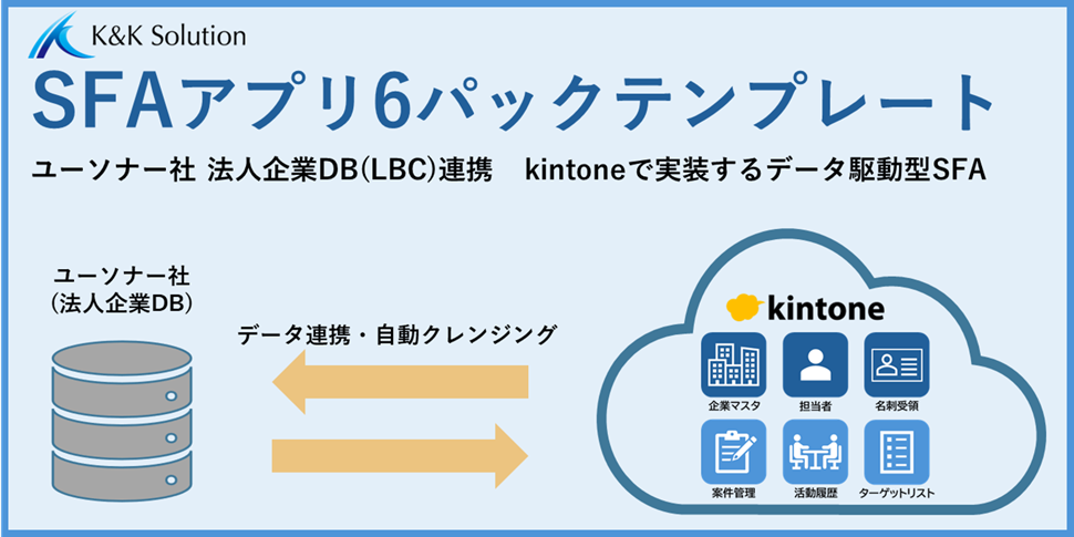 ユーソナー社の法人企業データベース(LBC)と連携し、企業・担当者・名刺受領情報を管理するとともに、それらの情報を参照できる案件管理、活動履歴、ターゲットリストアプリで構成されています。