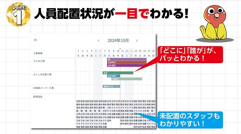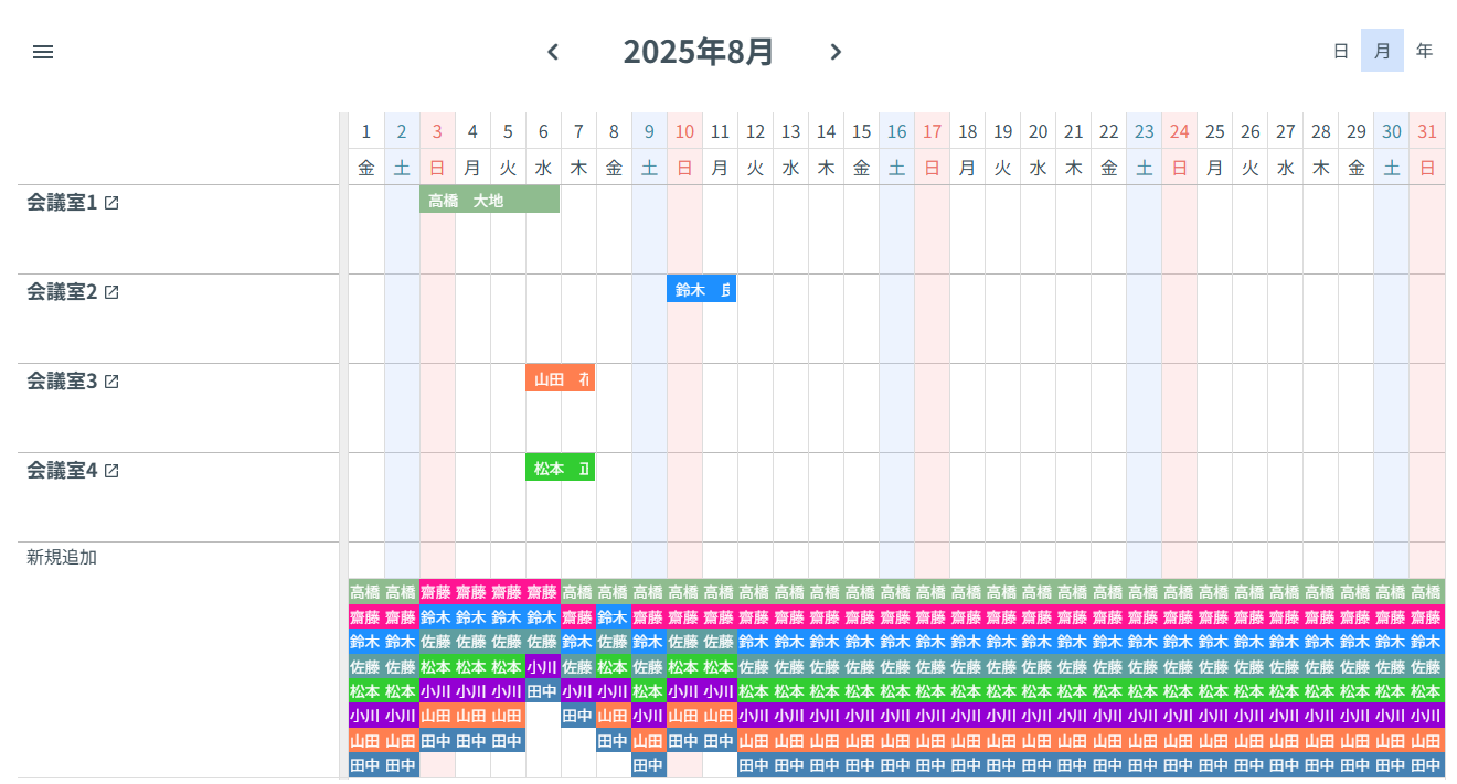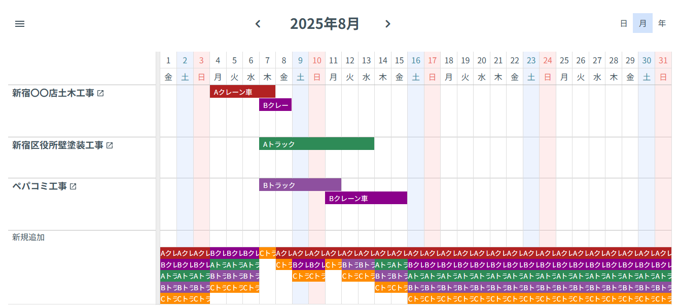 色分けや期間表示により、リソースの偏りや重複を瞬時に発見でき、迅速な調整につなげられます。