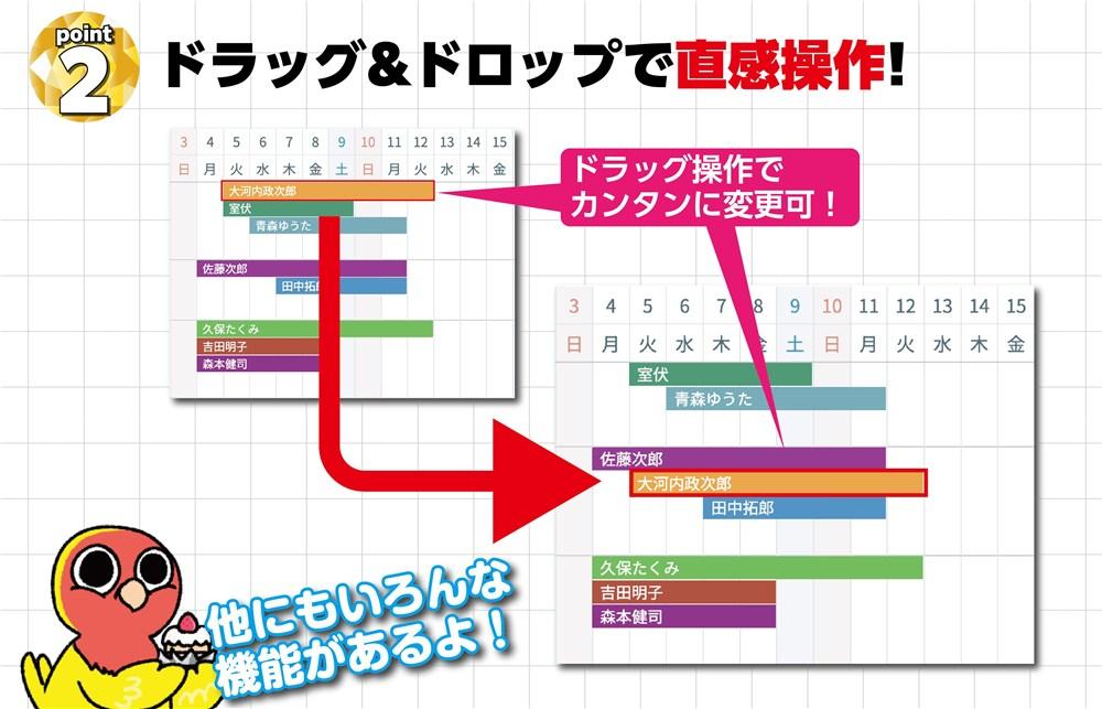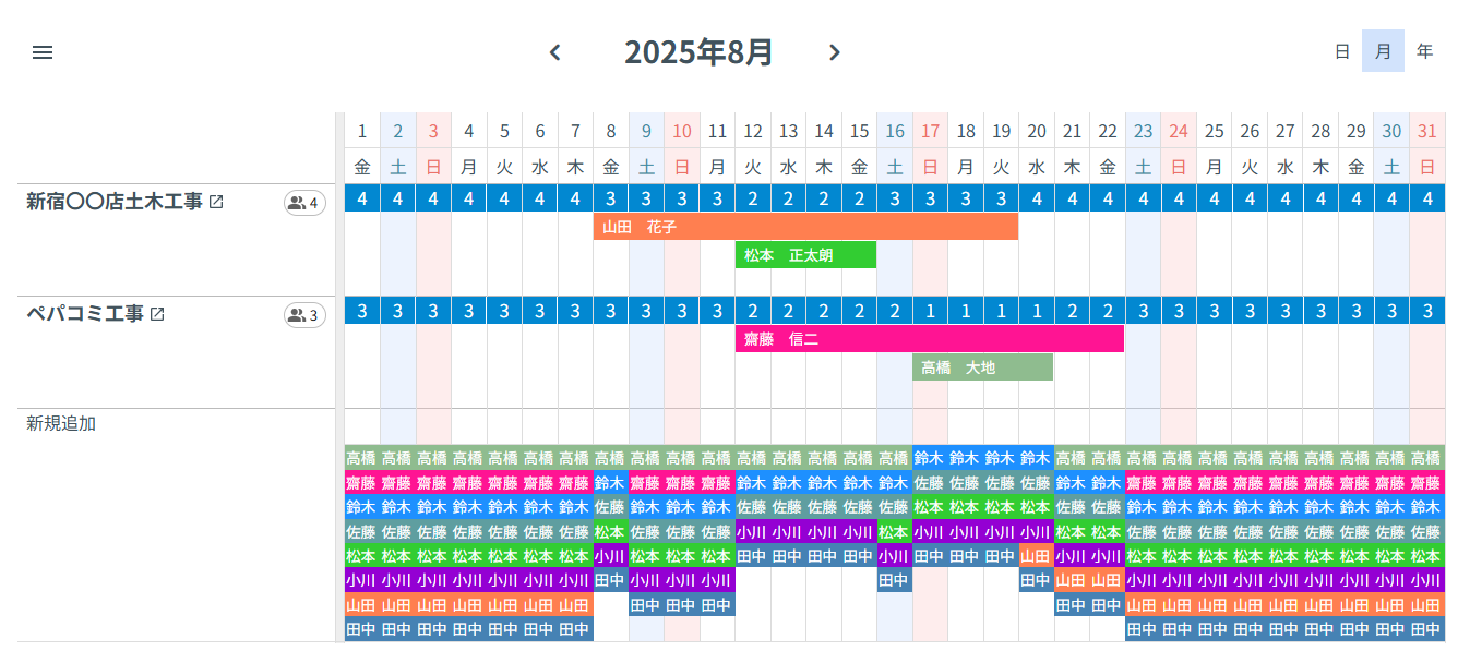 ガントチャート形式で人員配置ができるプラグインです。人員管理、シフト管理、プロジェクト管理など様々な用途で活用できます。