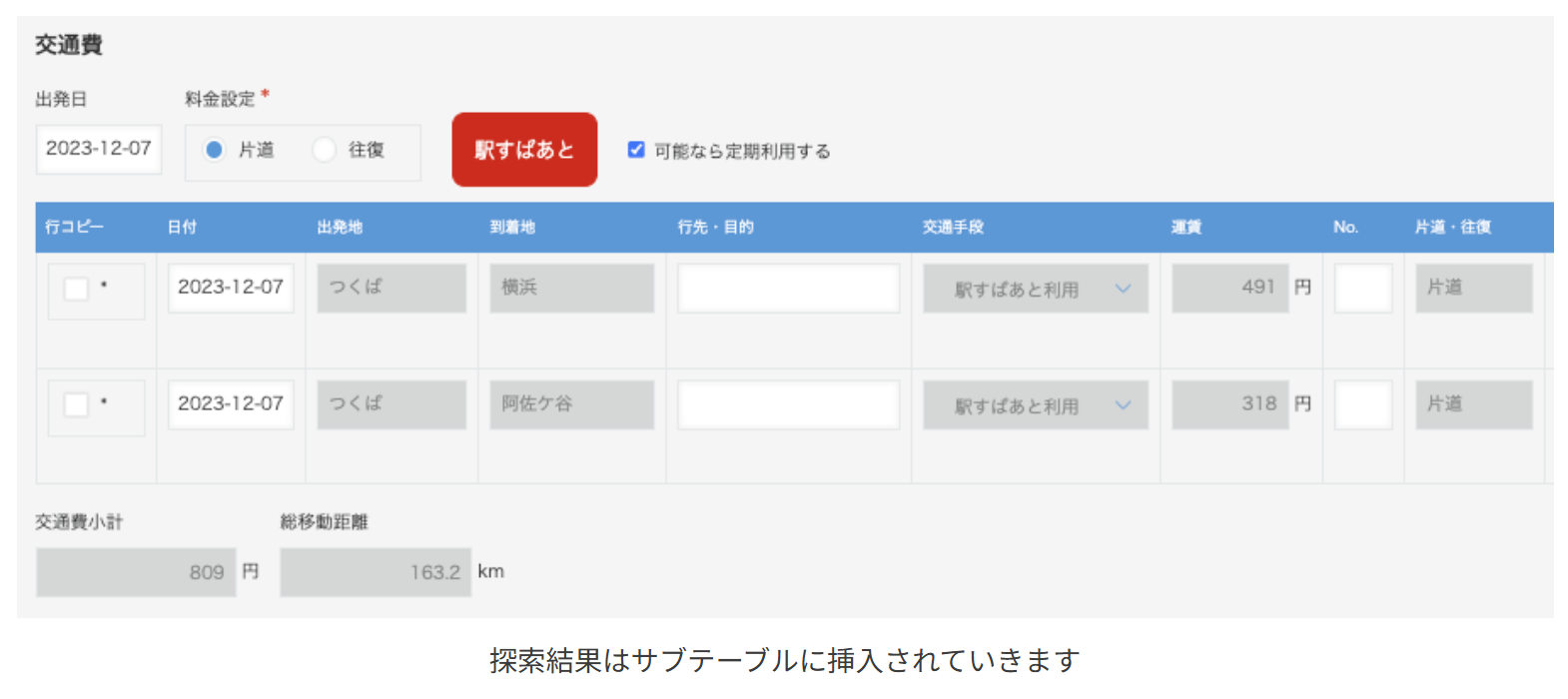 電車の出発地・到着地・経由地を入力するだけで正確な運賃を自動取得。定期区間の控除にも対応し、移動距離や金額をkintoneに自動反映します。