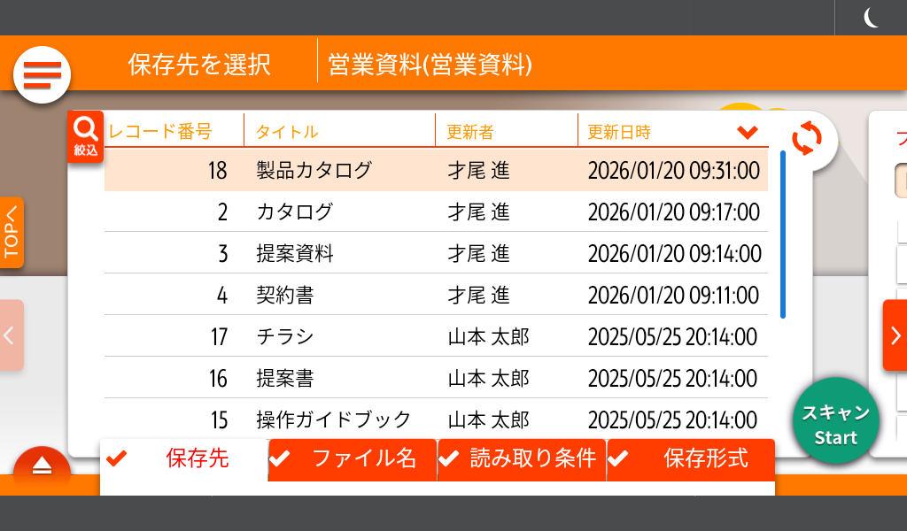 社内に戻って、複合機のパネル上で入力したレコードを選択し契約書や関連書類をスキャンして保存。