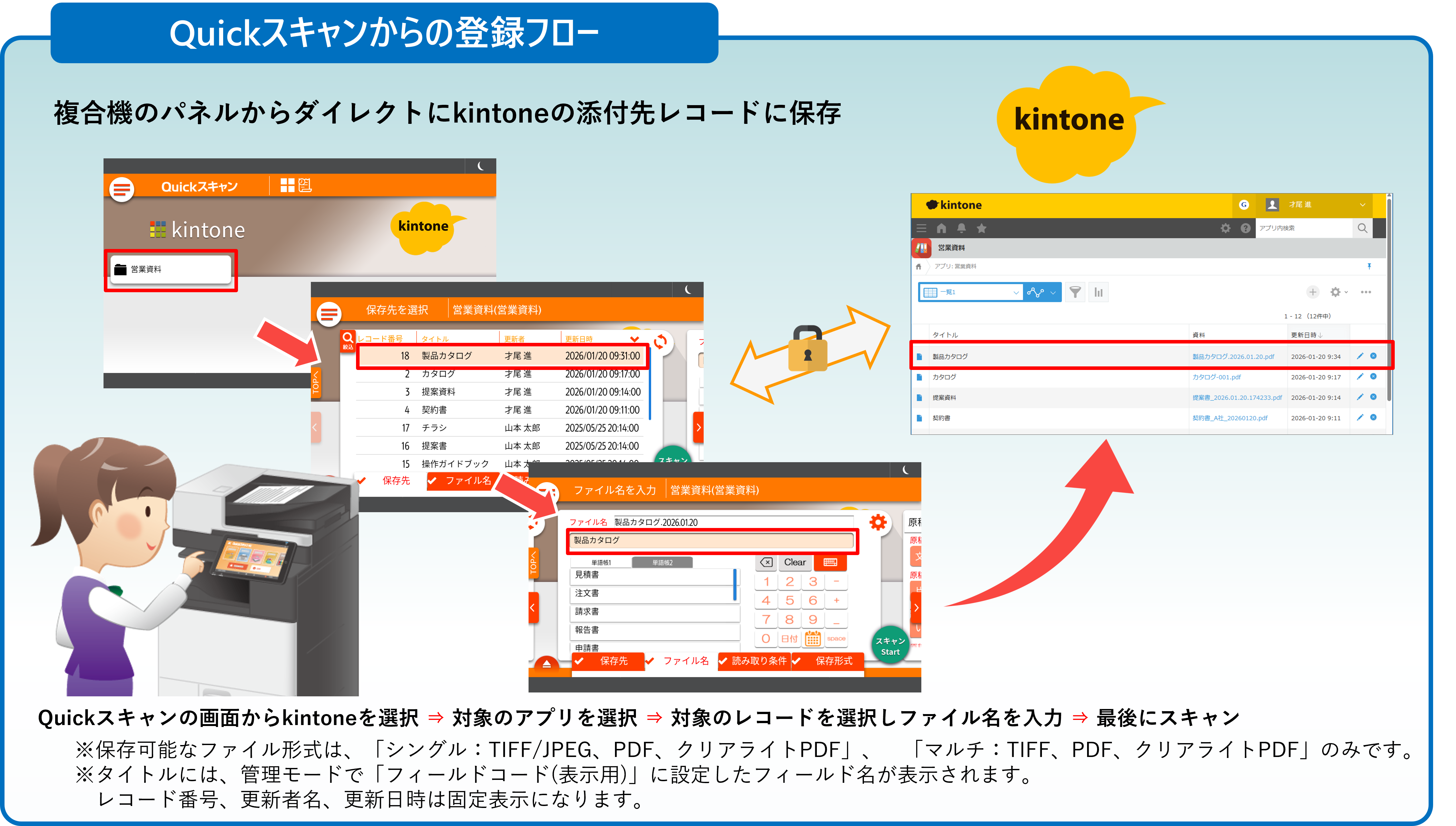 Quickスキャンは、kintoneアプリへの紙文書の登録を複合機からダイレクトにできるソフトウェアです。