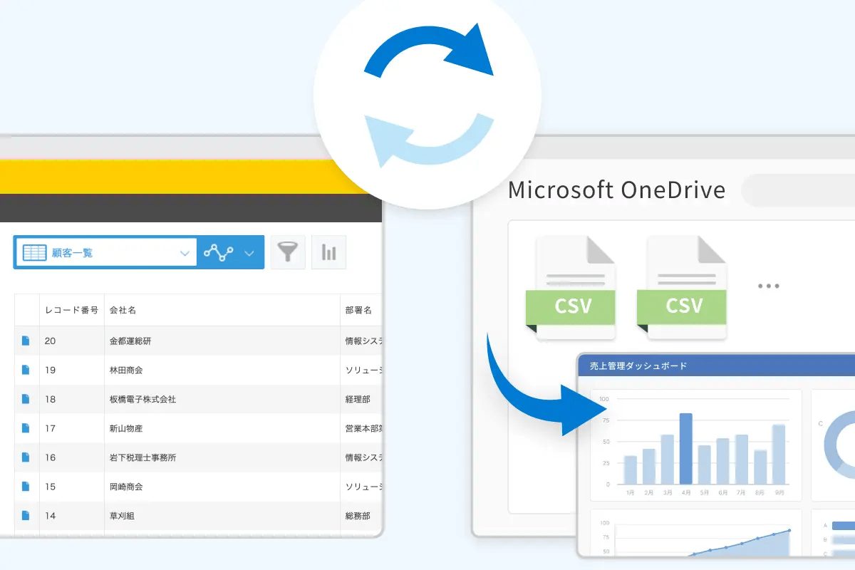 定期バックアップのデータを⾃動でOneDriveやGoogle Driveに保存できます。kintoneのデータをCSV形式で書き出す⼿間を削減でき、より効率よくデータ分析を⾏えます。