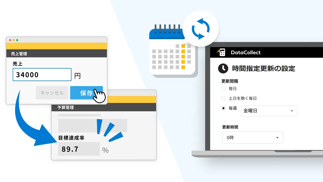 売上実績と月別予算を突き合わせて、予算達成状況を自動で集計・可視化できます。