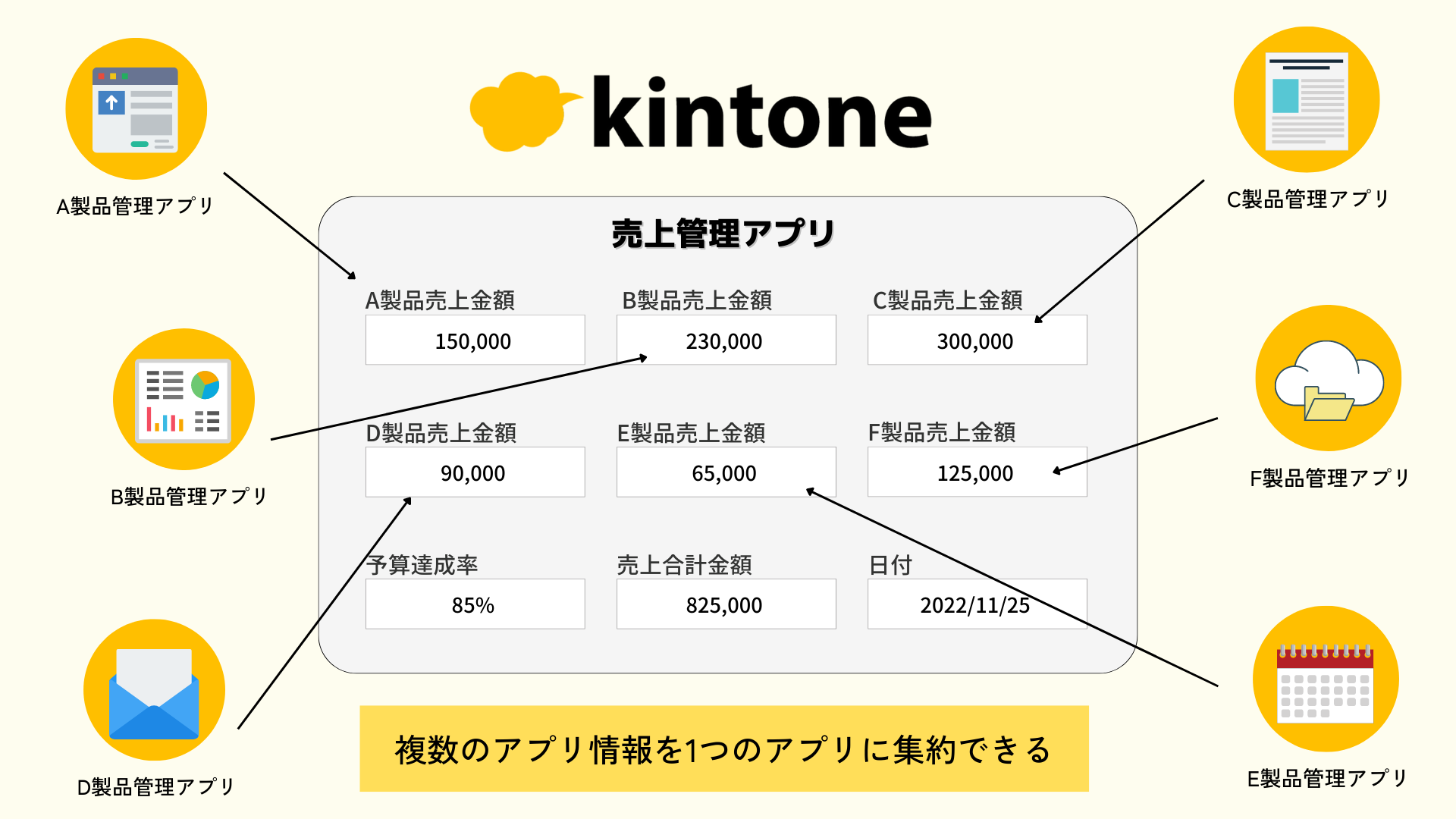 kintone上の複数アプリ・複数フィールドを横断してデータを収集し、自動でまとめることができます。